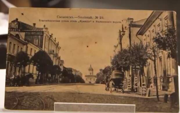 Открытка была отправлена из Смоленска 20 октября 1914 года. На ней изображена Благовещенская улица (нынешняя Большая Советская), отель «Франция» и вдалеке Молоховские ворота, которые подписаны как Малаховские.