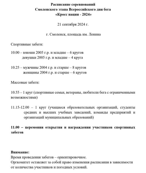 Организаторы обнародовали расписание областного этапа ежегодного всероссийского Дня бега «Кросс нации», который пройдёт в эту субботу на площади Ленина Смоленска.