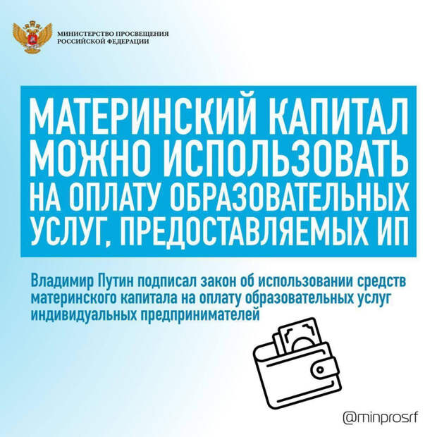 Ранее Владимир Путин подписал соответствующий указ, разрешающий тратить данные средства на учреждения, созданные индивидуальными предпринимателями.
