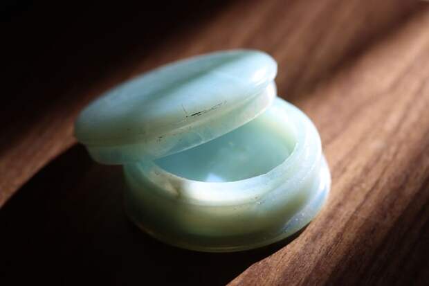 Первый предмет, о котором рассказывают археологи – пудреница или шкатулка, сделанная из опалесцентного стекла. Ученые поясняют, что название стекло получило из-за сходства с опалом: в отражённом свете оно выглядит голубовато-дымчатым, а на просвет – обычно жёлто-оранжевым.