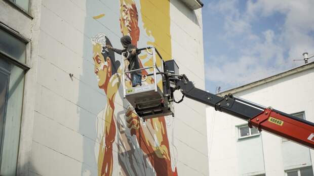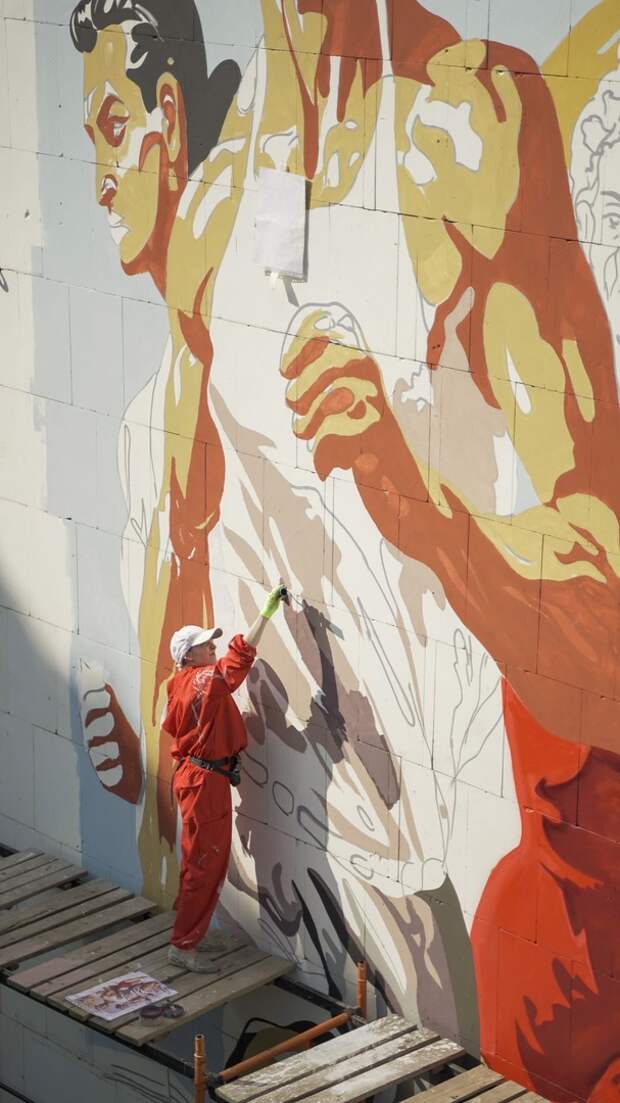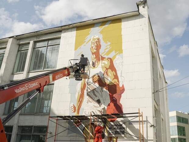 На фасаде спорткомплекса «Урожай» в центре Смоленска создают новый стрит-арт.