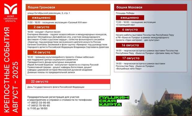 Музей «Смоленская крепость» приглашает жителей и гостей областного центра на новые увлекательные встречи. Концерты, мультимедийные проекты, выставки, творческие мастер-классы и знакомство с культурой Перу - публикуем программу на август.
