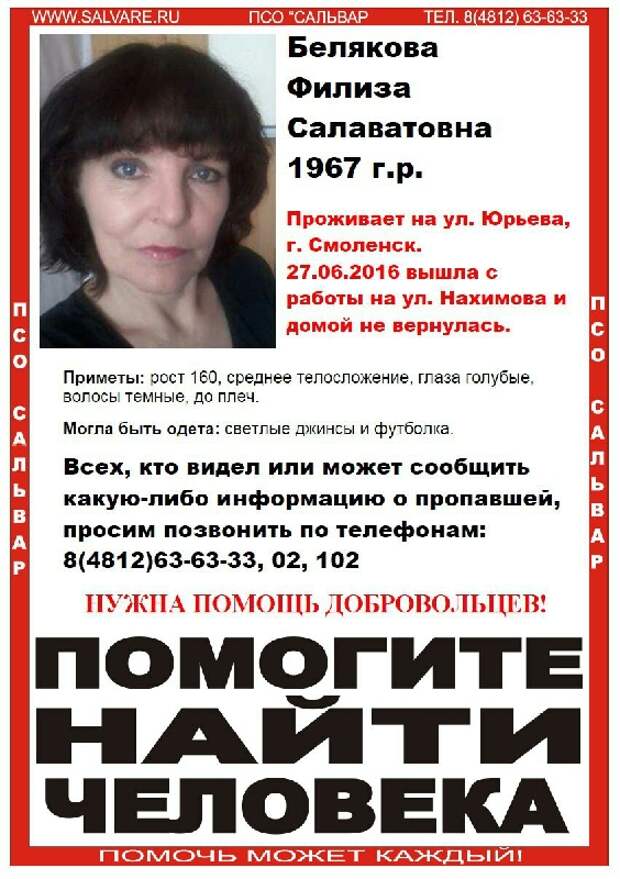 В Смоленске разыскивают 49-летнюю Филизу Белякову. Сообщение об этом появилось на официальной страничке ПСО «Сальвар» в соцсети.