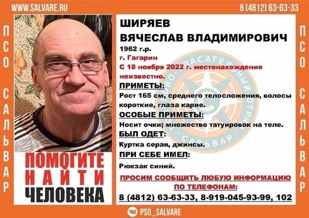 Напомним, ранее в соцсети сообщили о том, что в Гагарине разыскивают без вести пропавшего Ширяева Вячеслава Владимировича 60 лет.
