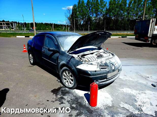 Первый раз пожарные приехали на 359 километр автодороги в Кардымовском округе. Примерно в половину одиннадцатого утра там загорелась легковая иномарка Renault.